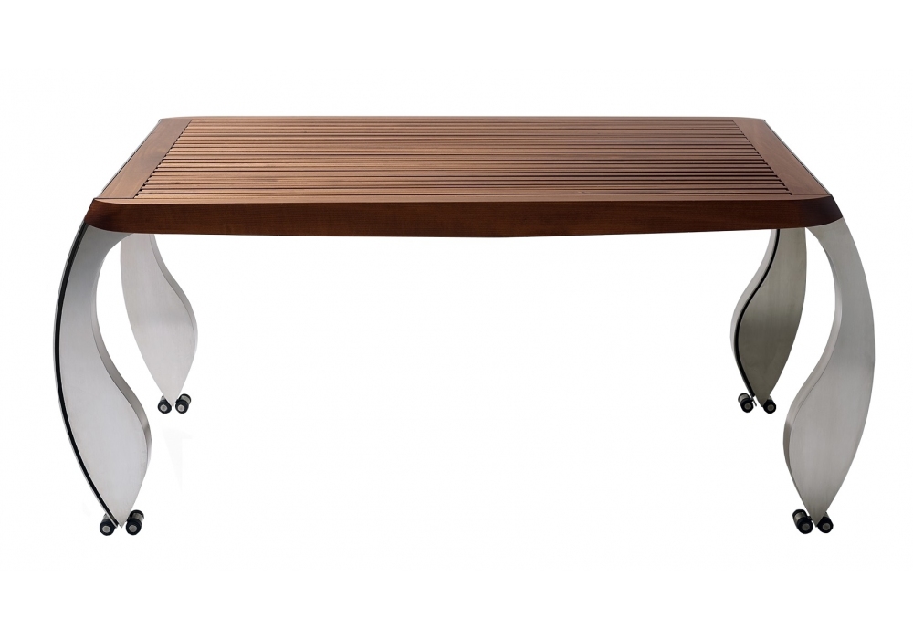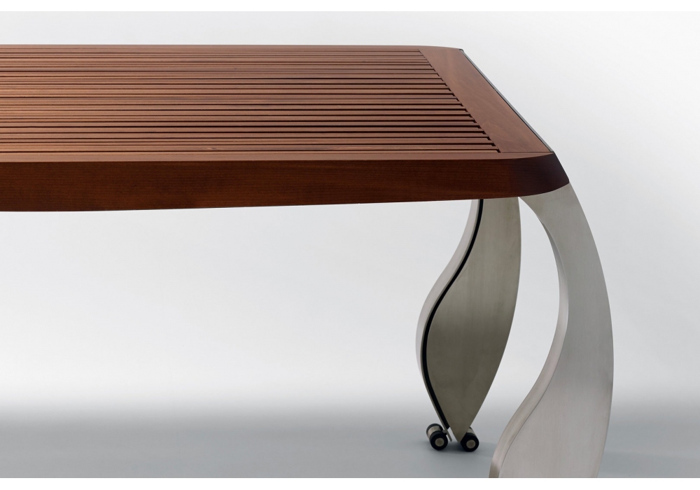 Split diseñada por Ron Arad para Poltronova es una mesa extensible realizada con superficie de listones de madera y patas curvas de acero cepillado con ruedas.