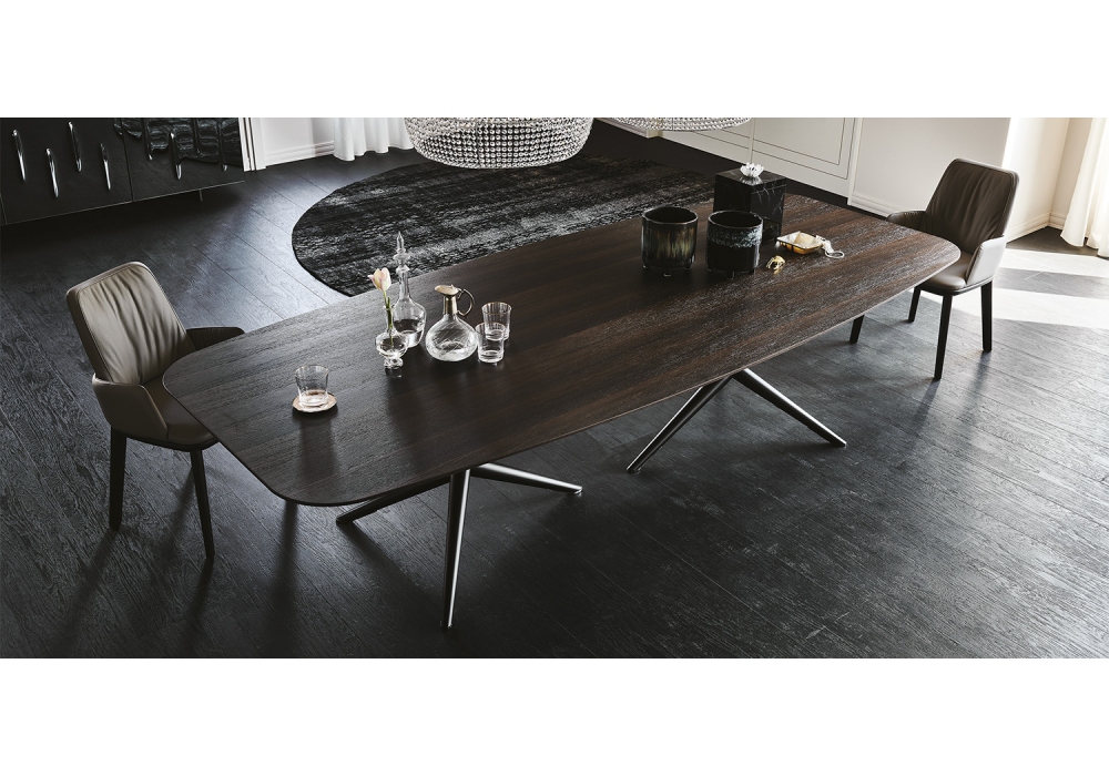 Atlantis Wood diseñado por Paolo Cattelan | para Cattelan Italia es una mesa realizada con base de acero barnizado gofrado y patas de cromo negro. Sobre de madera disponible en las siguientes versiones: con bordes oblicuos, con bordes irregulares en macizo o con bordes biselados.