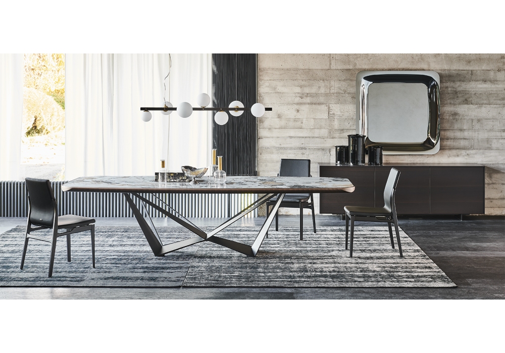 Skorpio Keramik Premium diseñado por Paolo Cattelan para Cattelan Italia es una mesa realizada con base de acero barnizado gofrado y sobre en cerámica Marmi en variantes de color con perfil inferior redondeado barnizado Brushed Bronze o Brushed Grey. Grosor sobre de 6 cm en las medidas 160x160 y 300x128 cm y de 5 cm en las medidas 200x120 cm y 240x120 cm.