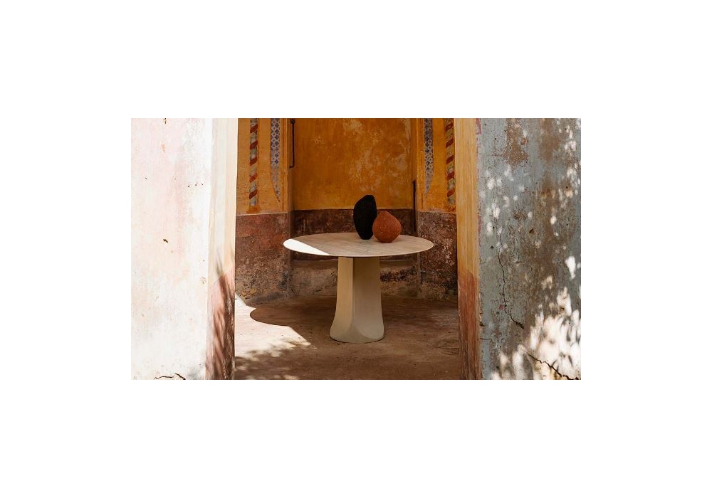 Togrul diseñada por Gordon Guillaumier para Tacchini es una mesa con base rígida de poliuretano con acabados en material arcilloso, realizada con tierra 100% cruda y alisada a mano por maestros artesanos. La encimera de mármol está disponible en versión redonda, con diferentes acabados.