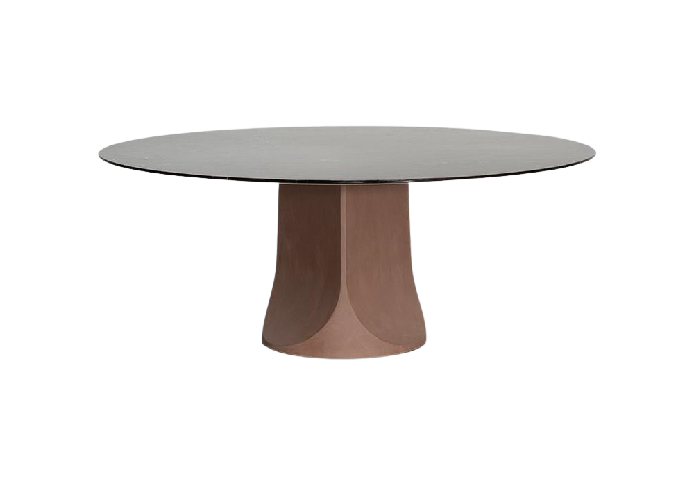 Togrul Large diseñada por Gordon Guillaumier para Tacchini es una mesa con base rígida de poliuretano con acabados en material arcilloso, realizada con tierra 100% cruda y alisada a mano por maestros artesanos. La tapa está disponible en mármol pulido u otros materiales.