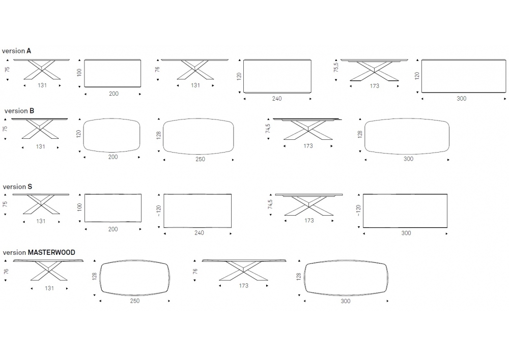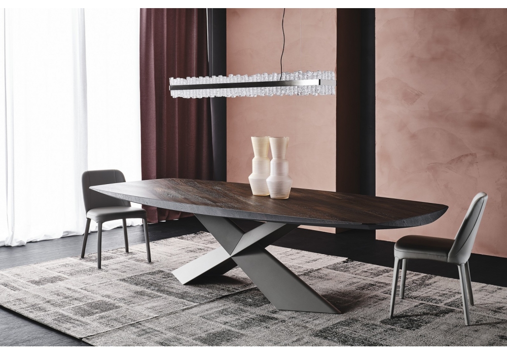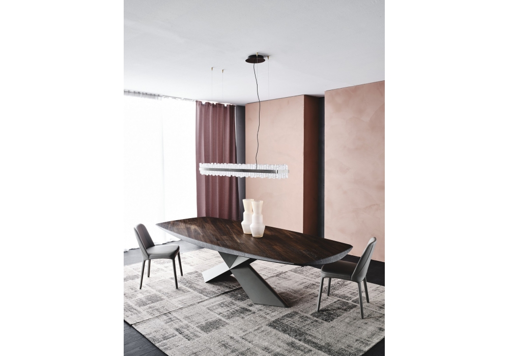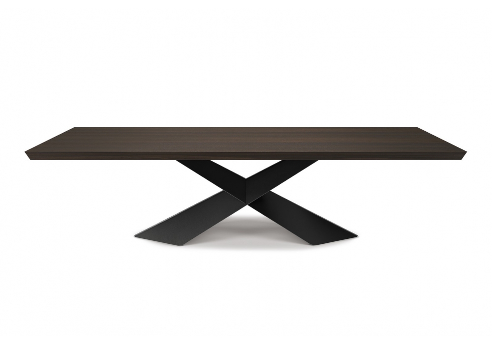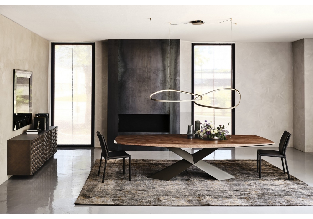 Tyron Wood diseñado por Paolo Cattelan para Cattelan Italia es una mesa realizada con base de acero barnizado gofrado. Sobre de madera disponible en las siguientes versiones: con bordes oblicuos, con bordes irregulares en macizo, con bordes biselados o “Masterwood”con sobre en forma de barco realizado con láminas de madera en posición diagonal (cantos oblicuos y redondeados hacia abajo).