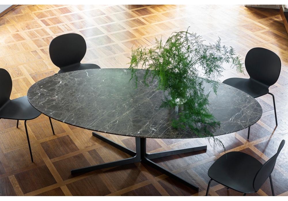 Split diseñada por Claesson Koivisto Rune para Tacchini es una mesa con base de metal pintado en polvo y tapa de MDF lacado. La base siempre es del mismo color que la tapa. Disponible en diferentes acabados y dimensiones.