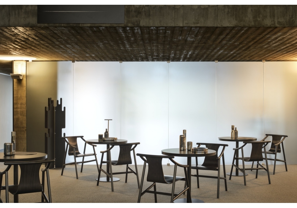 Porto diseñada por Gebrüder Thonet Vienna es una mesa de bar con montante redondo, tapa y base. Base en metal pintado negro mate o con acabado bronceado. Tablero revestido de laminado o chapa de roble natural o teñida.