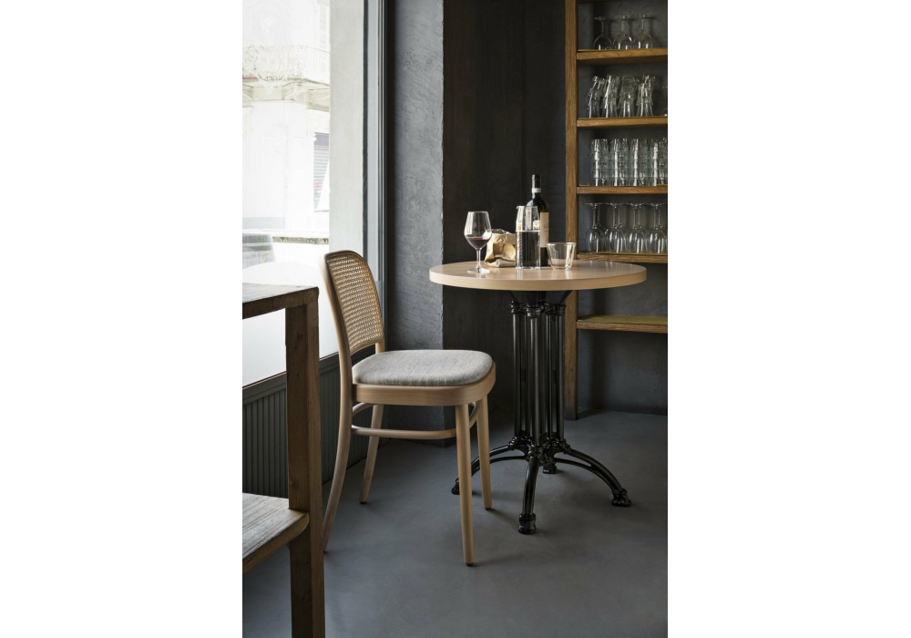 Vermouth diseñada por Gebrüder Thonet Vienna es una mesa de bar con estructura en hierro fundido pintado de negro. Tapa redonda en laminado o chapa de roble, natural o teñida.
