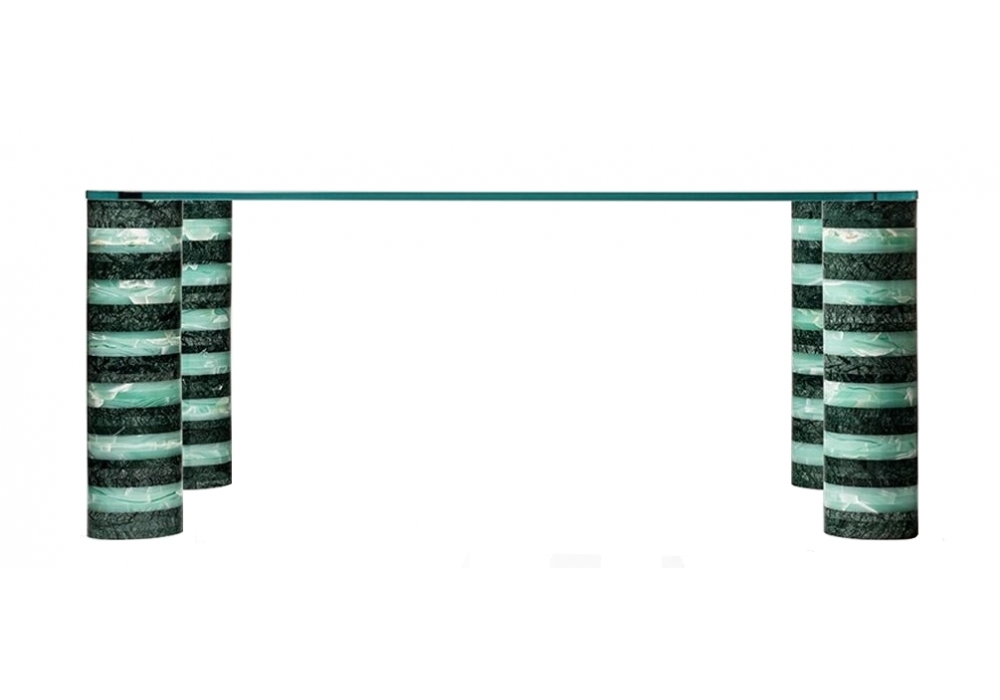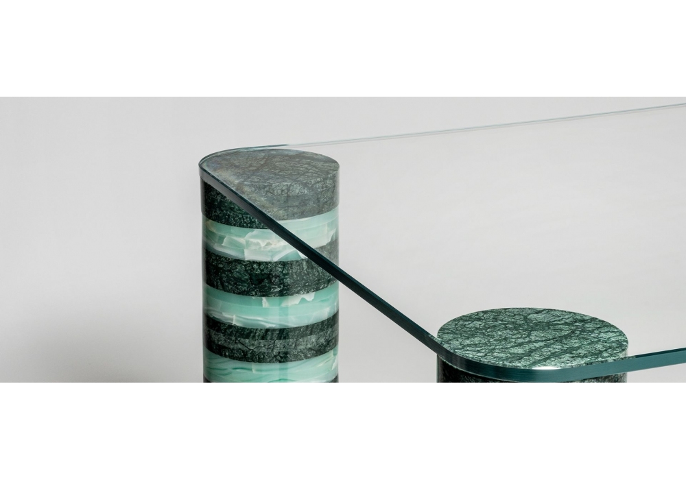 Architexture Living Table 01 diseñada por Patricia Urquiola para Budri es una mesa realizada con superficie de vidrio templado extraclaro y patas de mármol. Disponible en diferentes acabados y dimensiones.