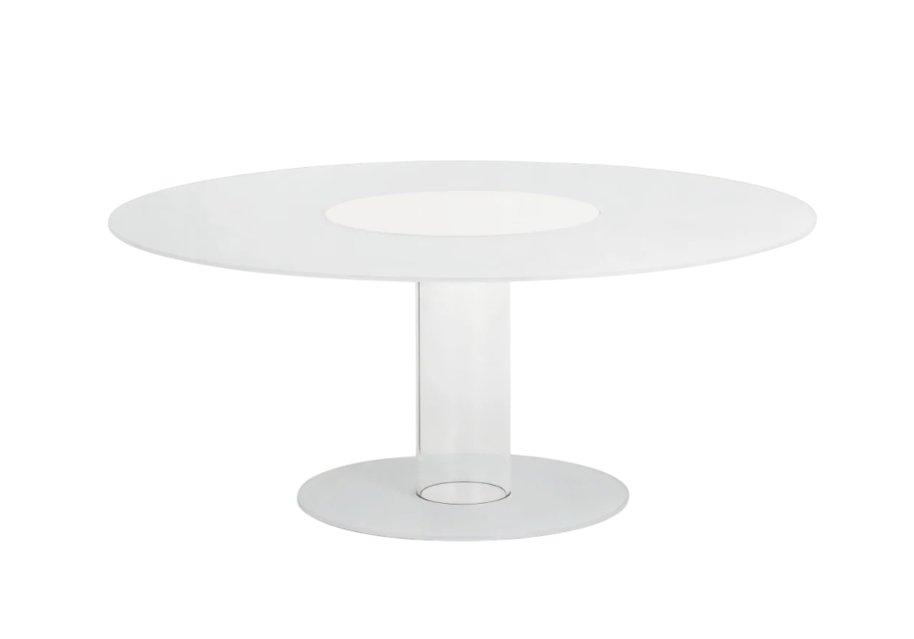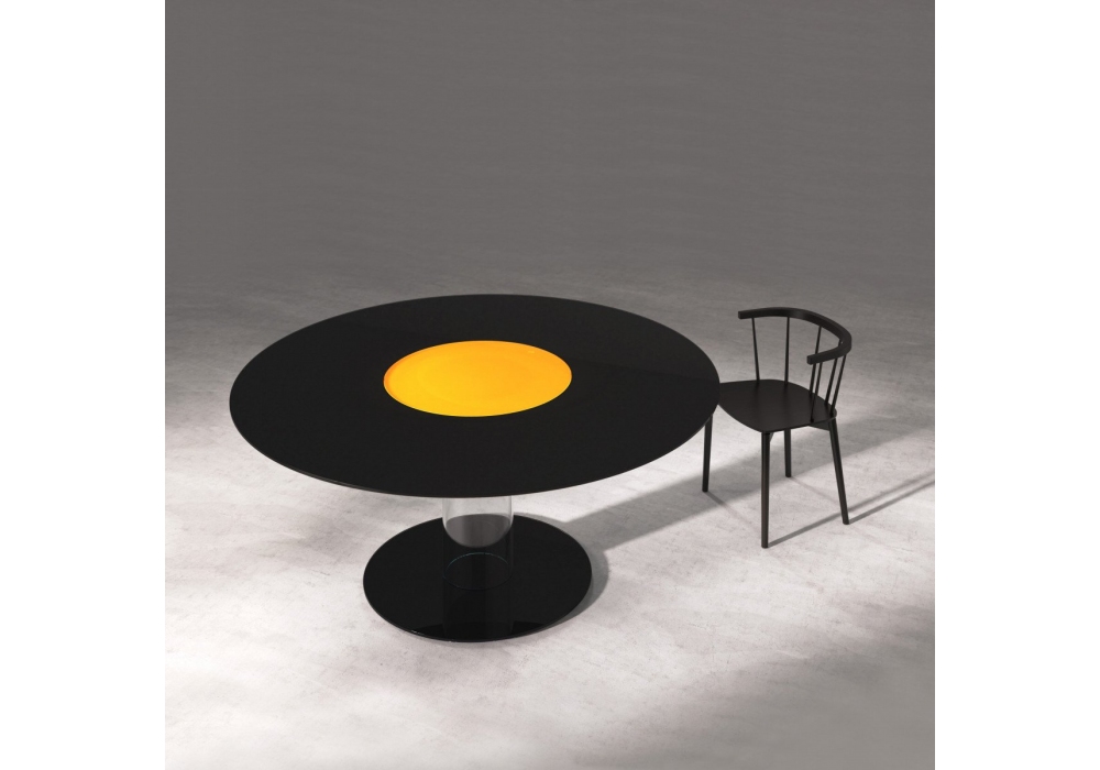 Lazy Hub diseñada por Piero Lissoni para Glas Italia es una mesa redonda con disco giratorio para servir alimentos Ø 70 cm, con movimiento, empotrado y alineado en el centro de la parte superior. El aro exterior del sobre y el pie de la mesa son de cristal templado de 12 mm, lacado brillante o mate, mientras que el acabado interior (disco giratorio) está disponible en diferentes acabados brillante o mate.