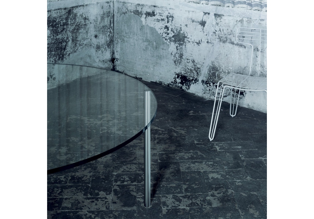 Metal, diseñada por Piero Lissoni para Glas Italia, es una mesa con tablero de vidrio templado extralight transparente. Las patas cilíndricas son de acero inoxidable anodizado cepillado o aluminio marrón oscuro.