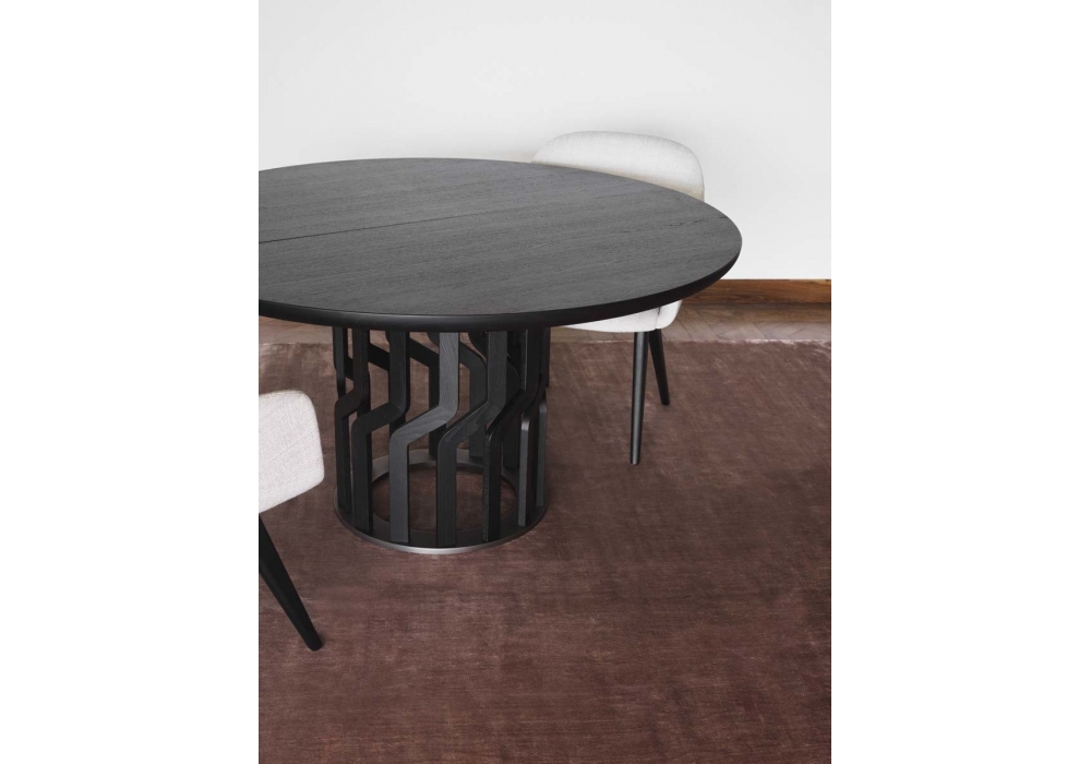 Intreccio TC1 diseñada por Nava + Arosio para Potocco es una mesa con base circular estructurada completamente en madera maciza de fresno en diferentes acabados. La parte superior tiene forma circular, extensible hasta 190 cm de longitud.