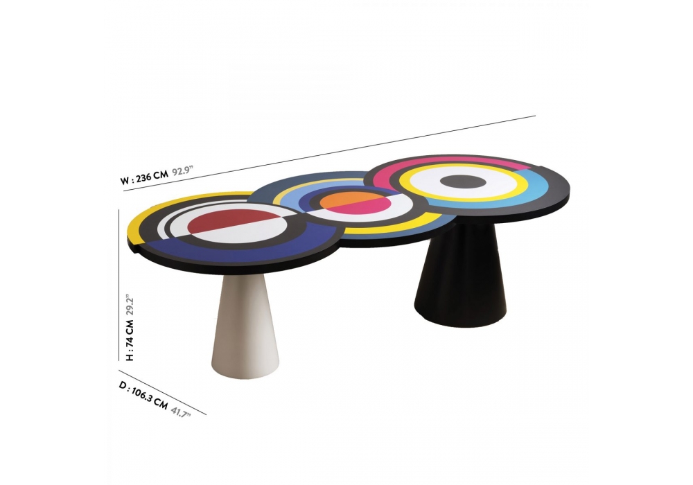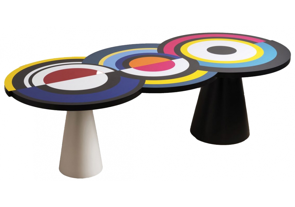 Sonia et Caetera Three diseñada por Thomas Dariel para Maison Dada es una mesa con tapa de madera maciza estructurada por la unión de tres tapas circulares pintadas en multicolor. La tapa descansa sobre dos grandes soportes cónicos, uno blanco y otro negro pintado.