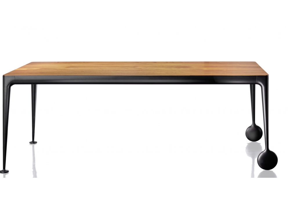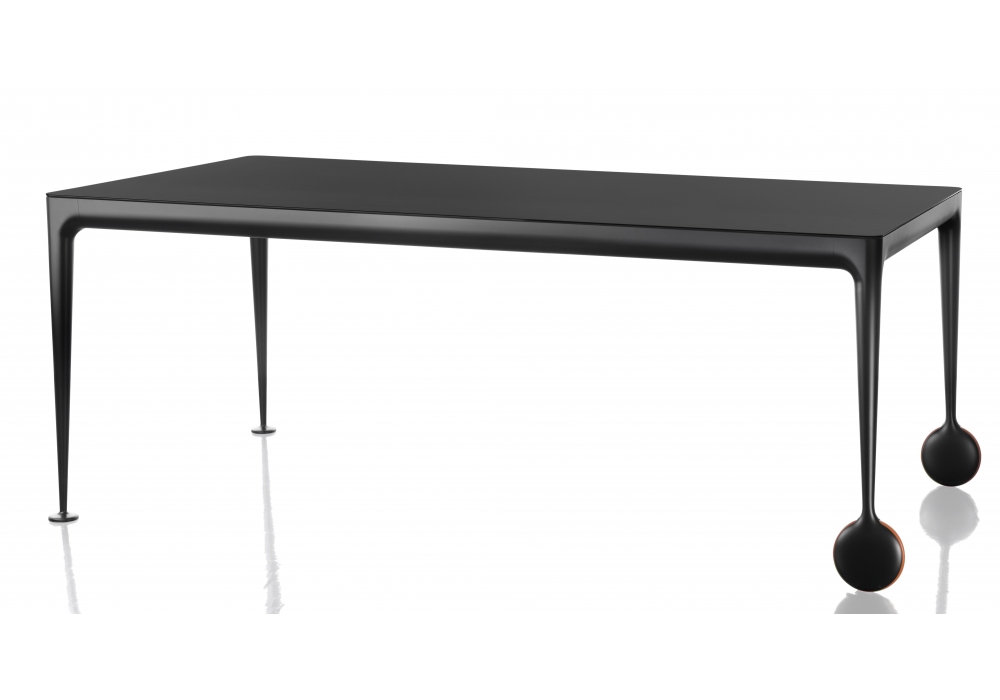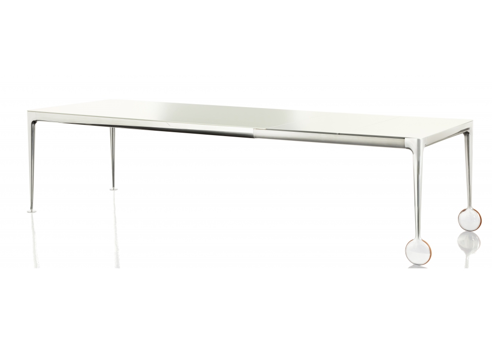 Big Will diseñada por Philippe Starck para Magis es una mesa extensible con patas en aluminio inyectado pulido o pintado. Travesaños en perfil de aluminio pintado. Tableros en cristal templado al ácido pulido o mate, en madera o gres en varios acabados. Extensiones en MDF laminado, pulido o pintado mate. Ruedas de goma.