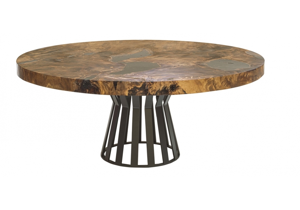 Kauri Round diseñada por C.R. & S. Riva 1920 es una mesa con tapa redonda realizada en madera maciza de Kauri combinada con una base formada por listones de hierro que se estrechan en el centro.