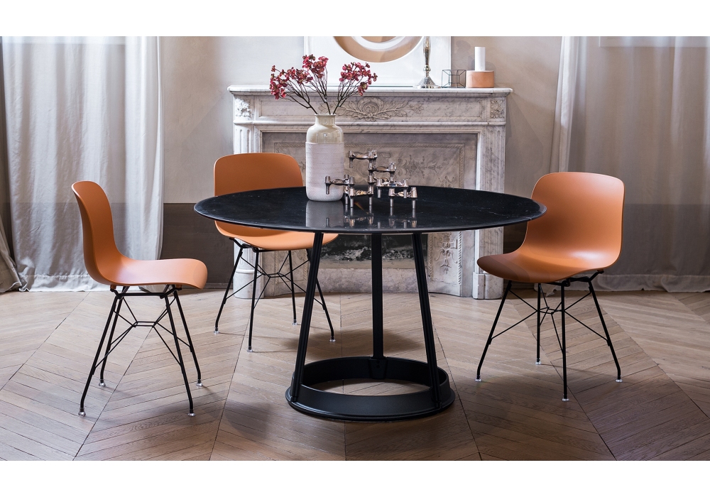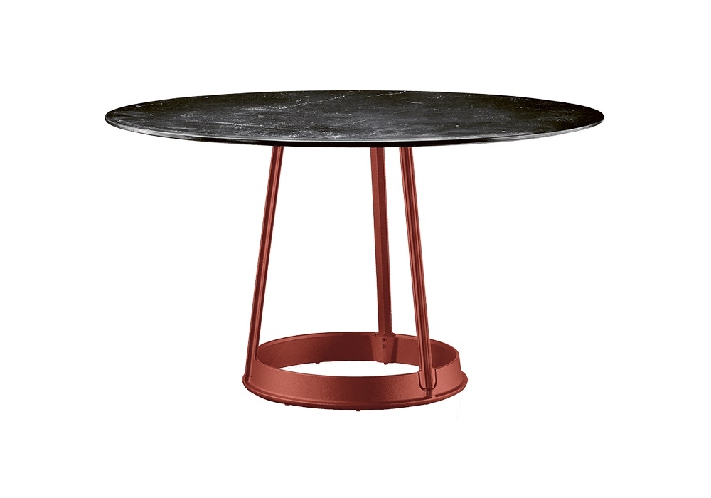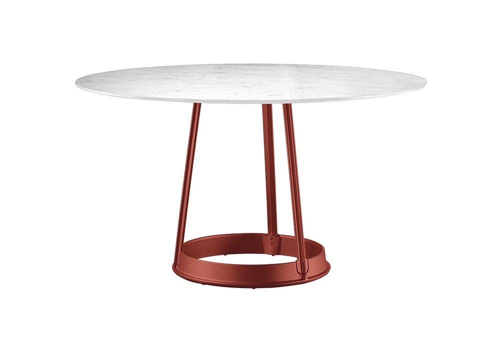 Brut 130 diseñada por Konstantin Grcic para Magis es una mesa redonda con estructura en hierro fundido pintado poliéster, disponible en diferentes acabados. Tapa en mármol de Carrara o Marquinia.