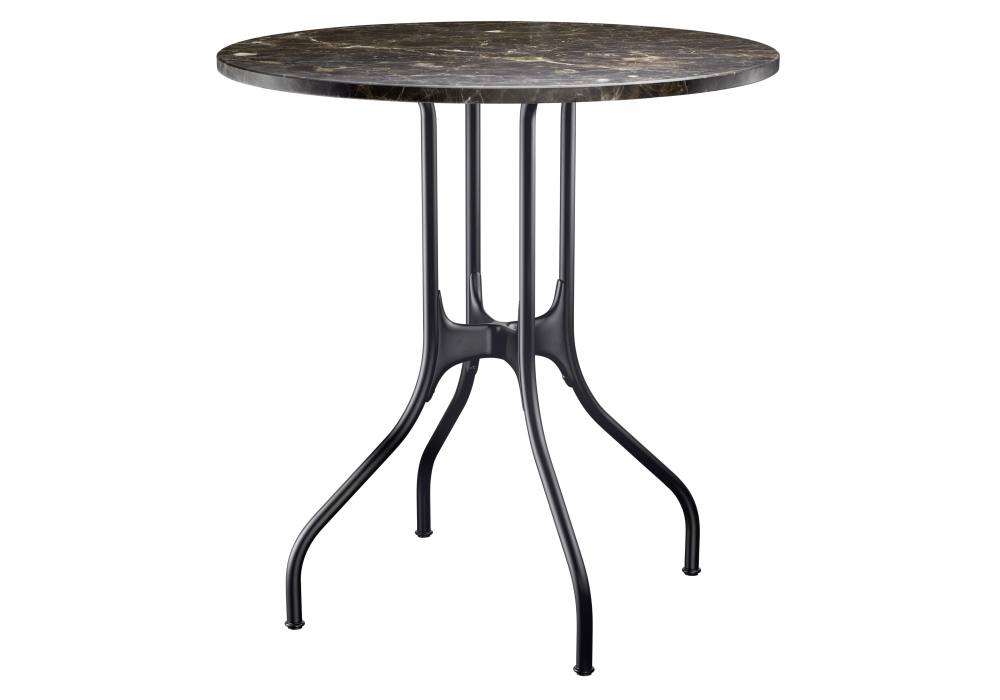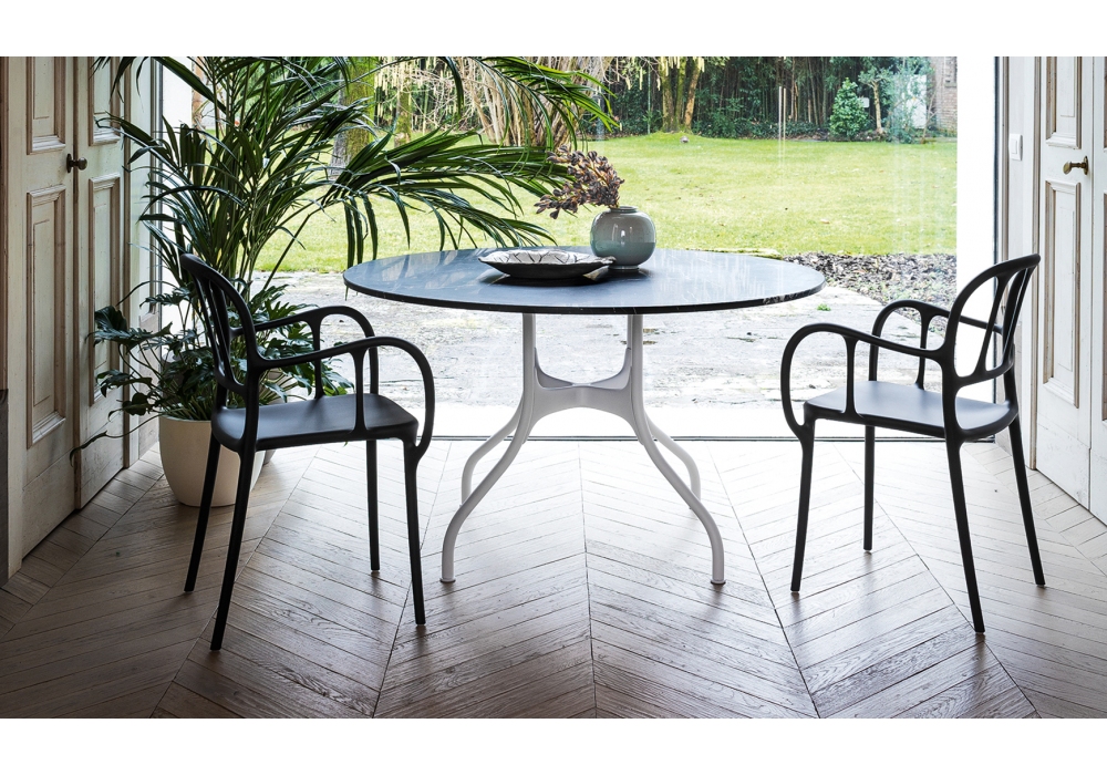 Milà diseñada por Jaime Hayón para Magis es una mesa redonda con estructura en tubo de acero tratado con cataforesis y pintado, articulación en aluminio fundido a presión pintado, tablero en HPL o mármol. Disponible en diferentes acabados y medidas.