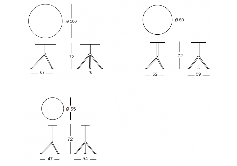 | Diámetro de la superficie | Ø 100 cm; Ø 80 cm; Ø 55 cm. |