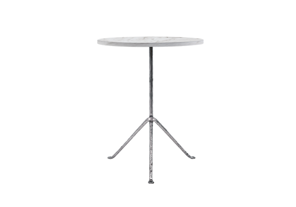 Officina Table diseñada por Ronan & Erwan Bouroullec para Magis es una mesa redonda con estructura de hierro forjado, galvanizado en caliente o pintado. Tablero de mármol o nogal americano macizo.