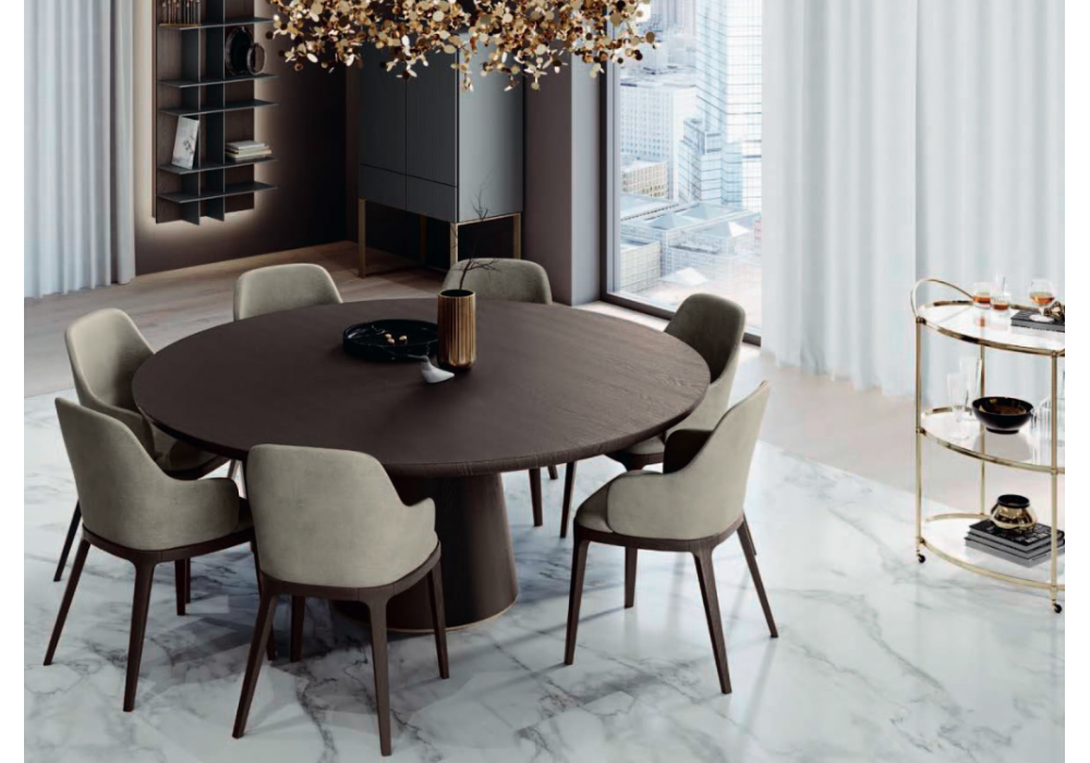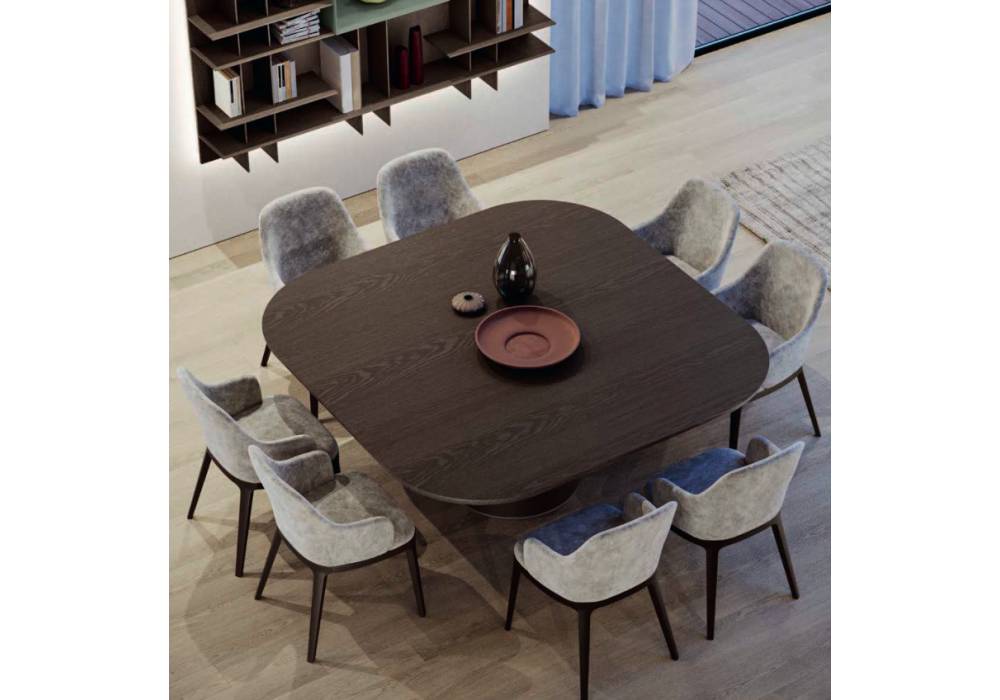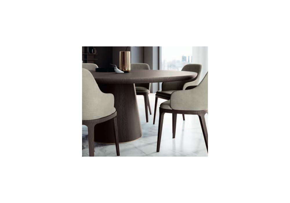 Mr. Big diseñada por Olivieri Lab para Olivieri es una mesa con base cónica en contrachapado curvado y chapado en roble flameado. La parte superior con un espesor de 5 cm. es de abeto macizo laminar chapado en roble flameado. Disponible en diferentes acabados y medidas.