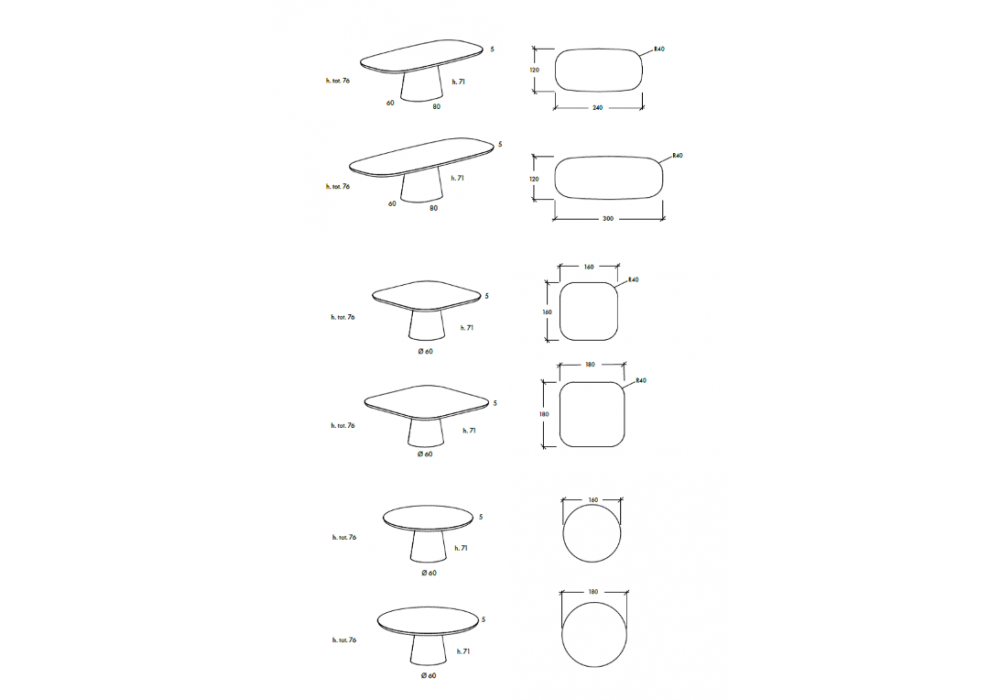 | Dimensiones | - Ø 160 x H 76 cm; - Ø 180 x H 76 cm; - 160 x 160 x H 76 cm; - 180 x 180 x H 76 cm; - 240 x 120 x H 76 cm; - 300 x 120 x H 76 cm. |