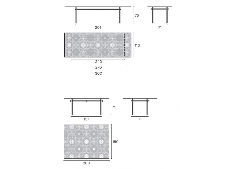 | Dimensiones | 240 x 110 x H 75 cm; 270 x 110 x H 75 cm; 300 x 110 x H 75 cm; 200 x 150 x H 75 cm. |