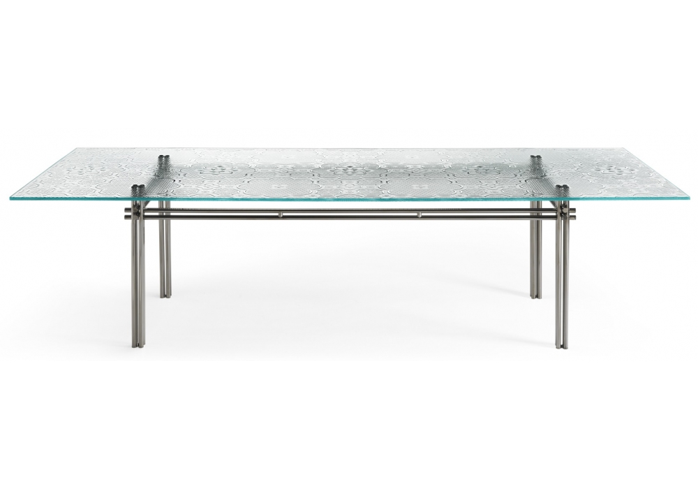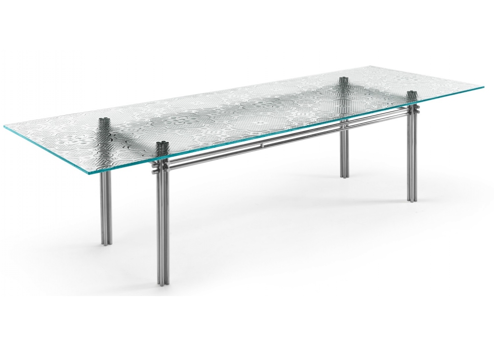 Cristaline diseñada por Marcel Wanders Studio para Fiam es una mesa con base en metal pintado y tapa en vidrio extraclaro fundido y templado, transparente o pintado con colores metalizados.