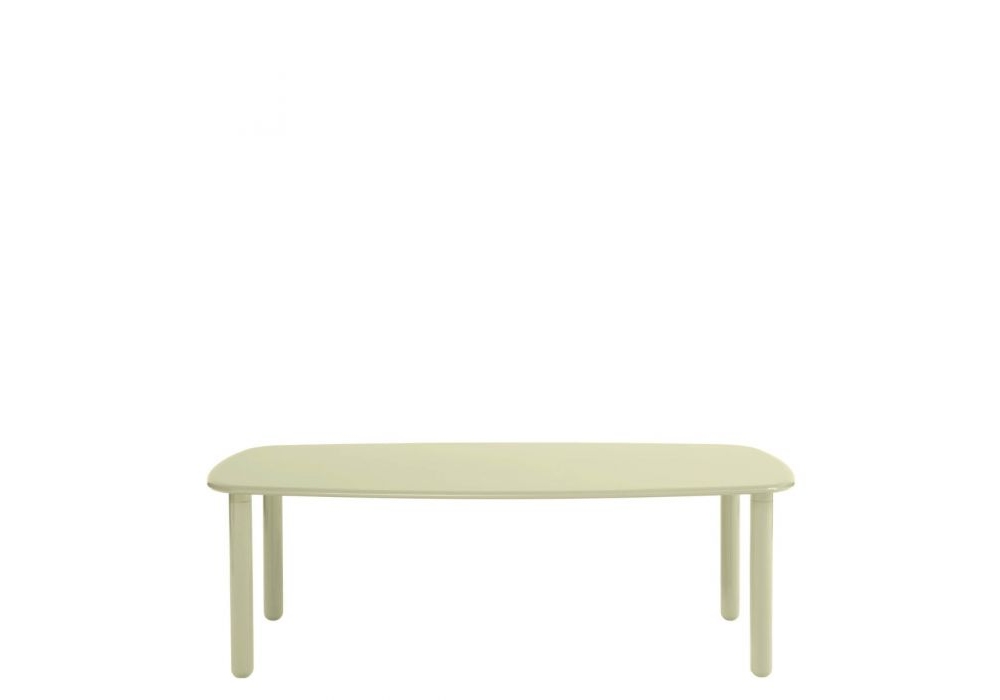 Tottori diseñada por Kateryna Sokolova para Driade es una mesa con tablero en MDF con borde en forma de "jabón" y esquinas redondeadas, patas en madera maciza con la parte apoyada en el suelo redondeada en semiesfera, estructura en acero, acabado lacado brillante rojo rubí. Solo para uso interno.