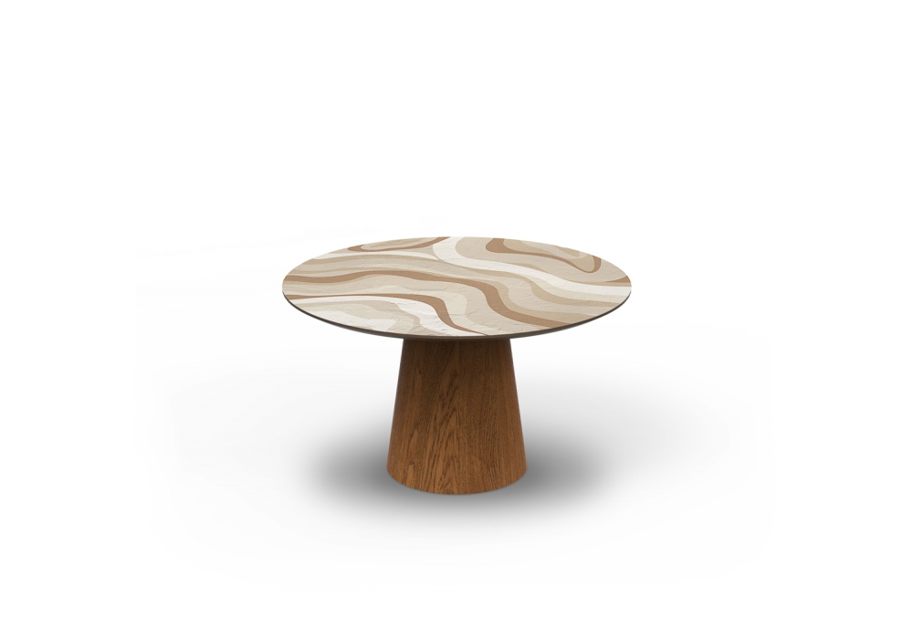 Watson diseñada por Momenti Lab para Momenti es una mesa con tableros redondos en mdf, con revestimiento de material aplicado a mano, impresión artística y acabado protector mate no tóxico o con impresión artística con acabado brillante brillante. Lateral inferior y cantos lacados. Pies cónicos en madera con acabado lacado o en madera teñida nogal. Incluye tornillería para fijación a la encimera. Disponible en diferentes tamaños.