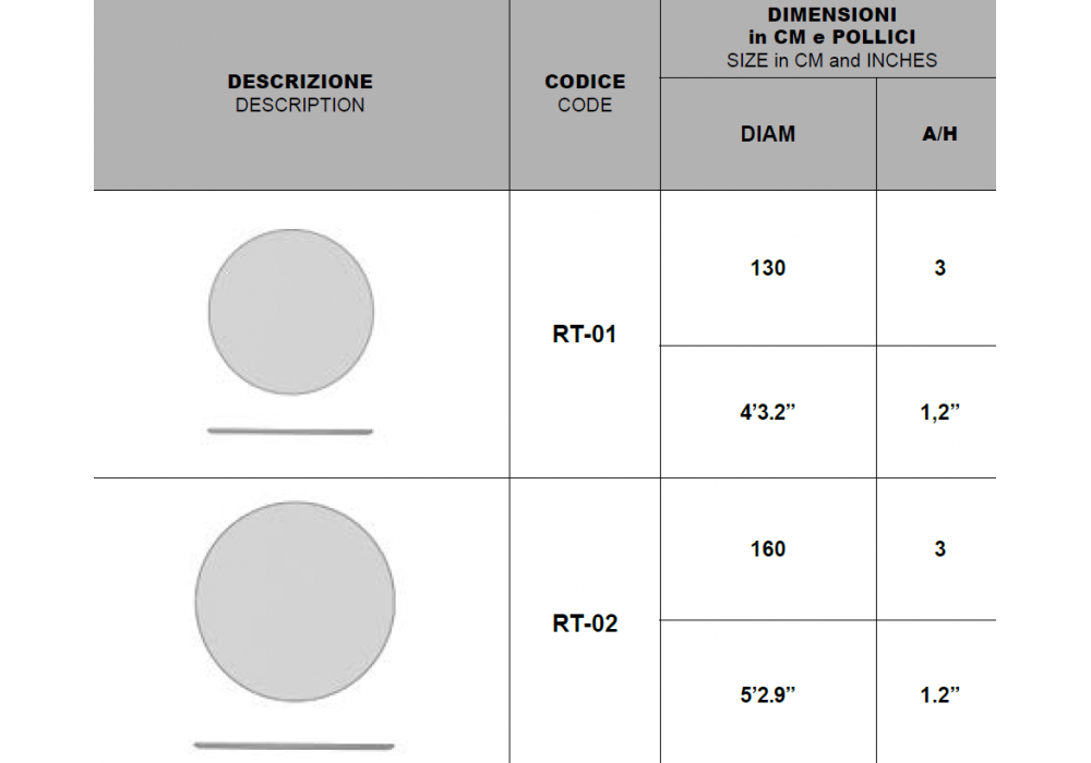 | Dimensiones | - Ø 130 cm; - Ø 160 cm. |