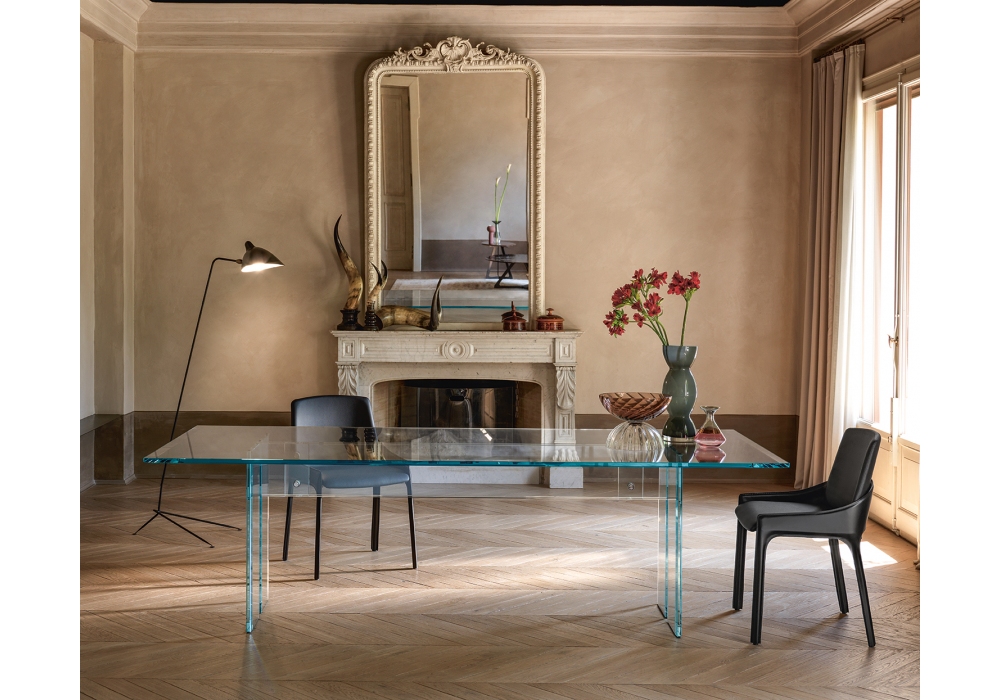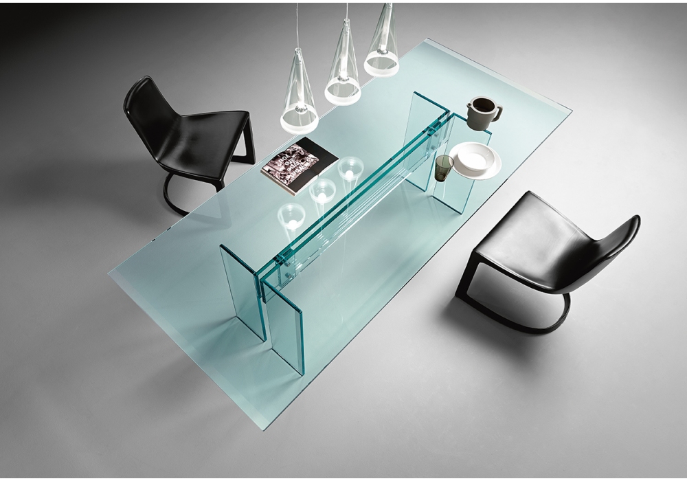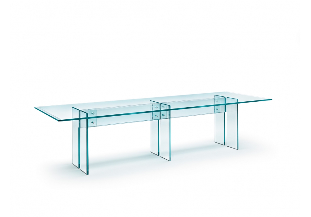 LLT diseñada por Dante O. Benini & Luca Gonzo para Fiam es una mesa con tapa en cristal transparente con bisel en dos lados cortos y estructura soldada en vidrio transparente con bisel en el borde. Detalles de fijación en acero inoxidable.
