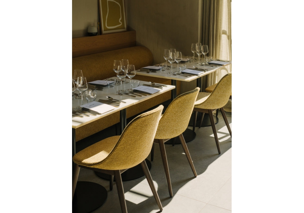 Harbour Column diseñada por Norm Architects para Audo Copenhagen es una mesa rectangular con base en aluminio y acero pintado en polvo negro, tapa en piedra Kunis Breccia, mármol Estremoz, roble teñido negro o linóleo. Disponible en diferentes alturas.