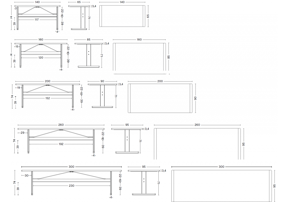 | Dimensiones | 140 x 75 x H 74 cm; 160 x 85 x H 74 cm; 200 x 90 x H 74 cm; 260 x 95 x H 74 cm; 300 x 95 x H 74 cm. |