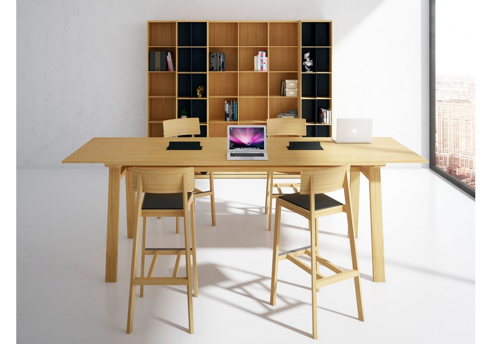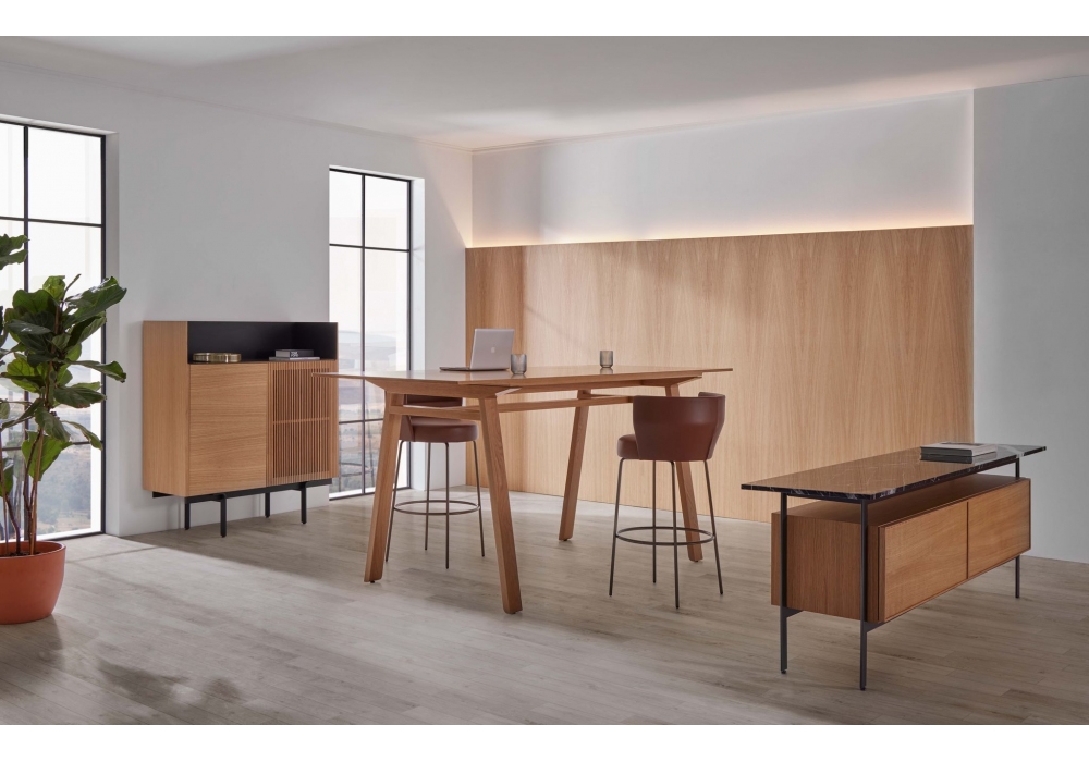 Mitis High diseñada por Mario Ruiz para Punt es una mesa alta con estructura en MDF chapado en nogal o roble y tapa en madera o cristal ahumado.
