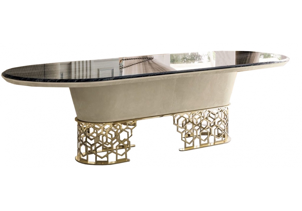 Clairmont diseñada por Giuseppe Iasparra para Longhi es una mesa con base en metal rectificado con láser con decoración "Sequence" y curvada. Carcasa tapizada en piel y tapa en mármol o espejo.