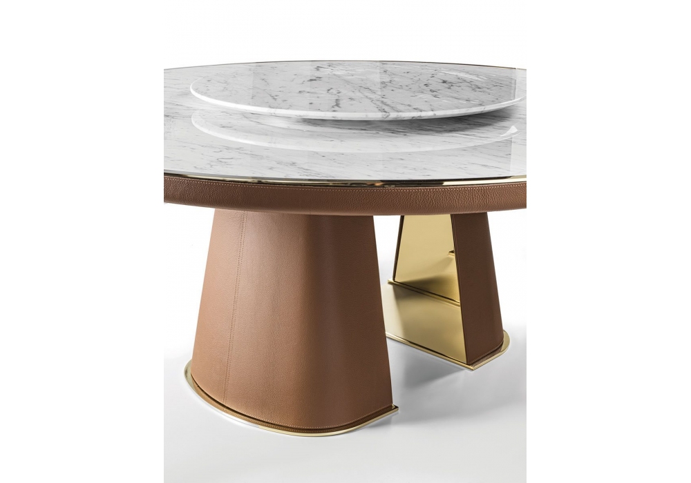 Journey Round diseñada por Ben Wu para Longhi es una mesa redonda con dos patas de fibra de vidrio recubiertas externamente de cuero e internamente con una chapa de metal brillante o mate. Pie al final de la pierna a juego en el interior. Tapa de mármol. Disponible en la versión con plato giratorio Lazy Susan en diferentes medidas y acabados.