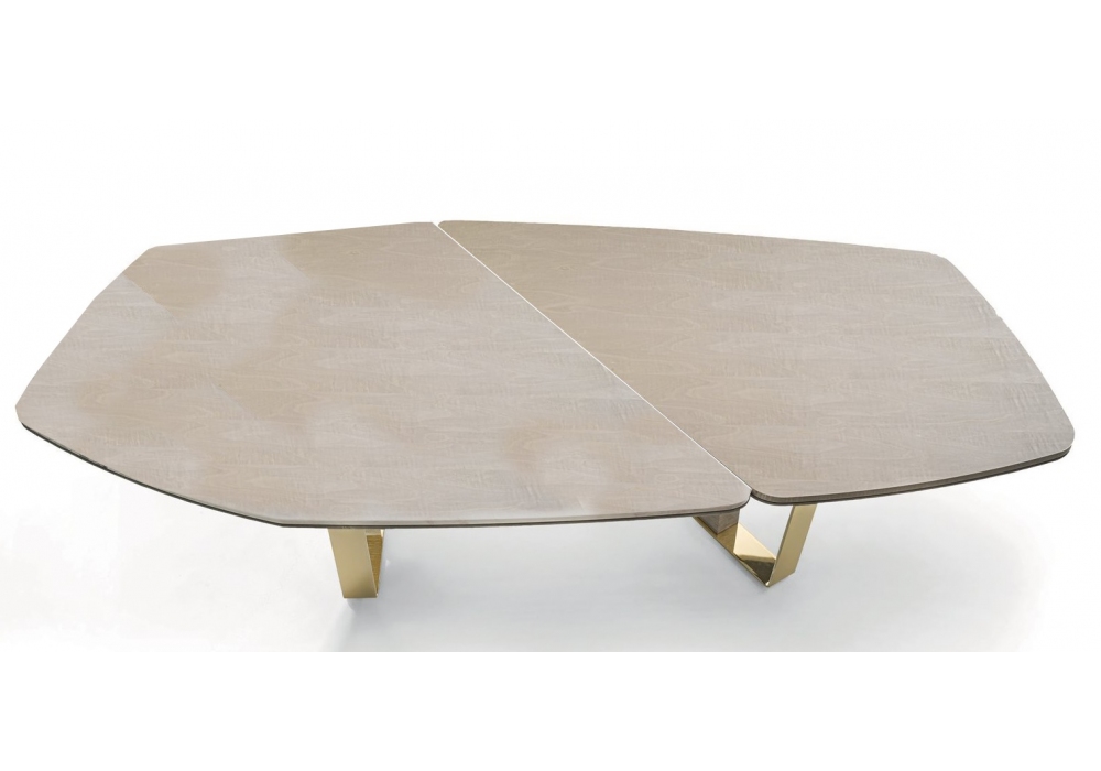 Keope diseñada por Giuseppe Viganò para Longhi es una mesa con dos patas trapezoidales en metal rectificado cortado con láser con inserciones revestidas en cuero. Tapa multimaterial perfilada y seccionada, realizada en mármol y dividida en 2 ó 3 partes. La tapa con piezas modulares en diferentes acabados está disponible bajo pedido.