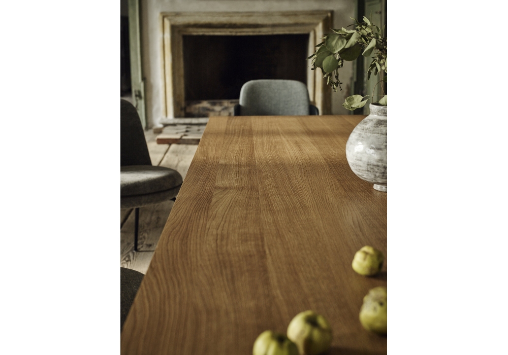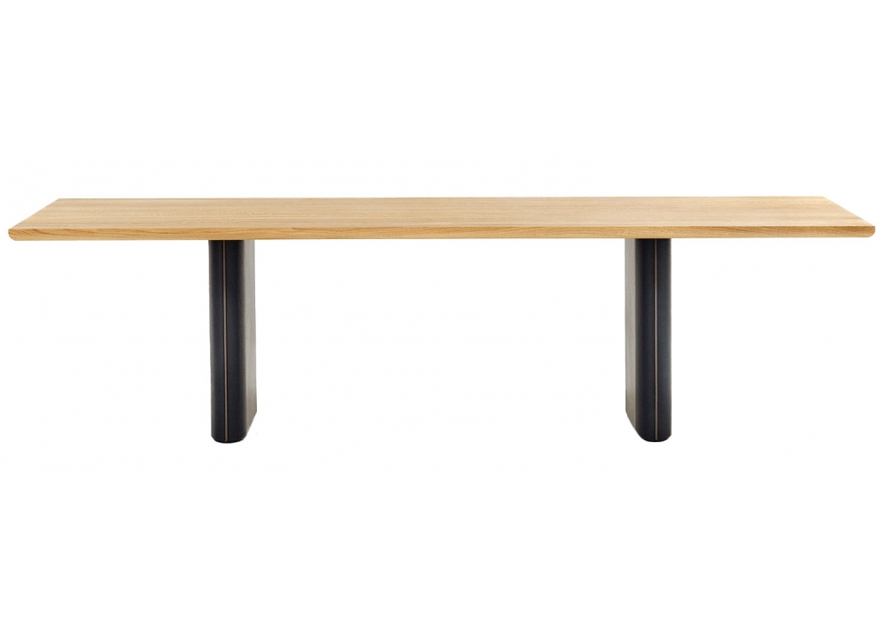 Merwyn diseñada por Sebastian Herkner para Wittmann es una mesa con tablero en madera de nogal natural y patas revestidas en cuero. Disponible en dos tamaños.