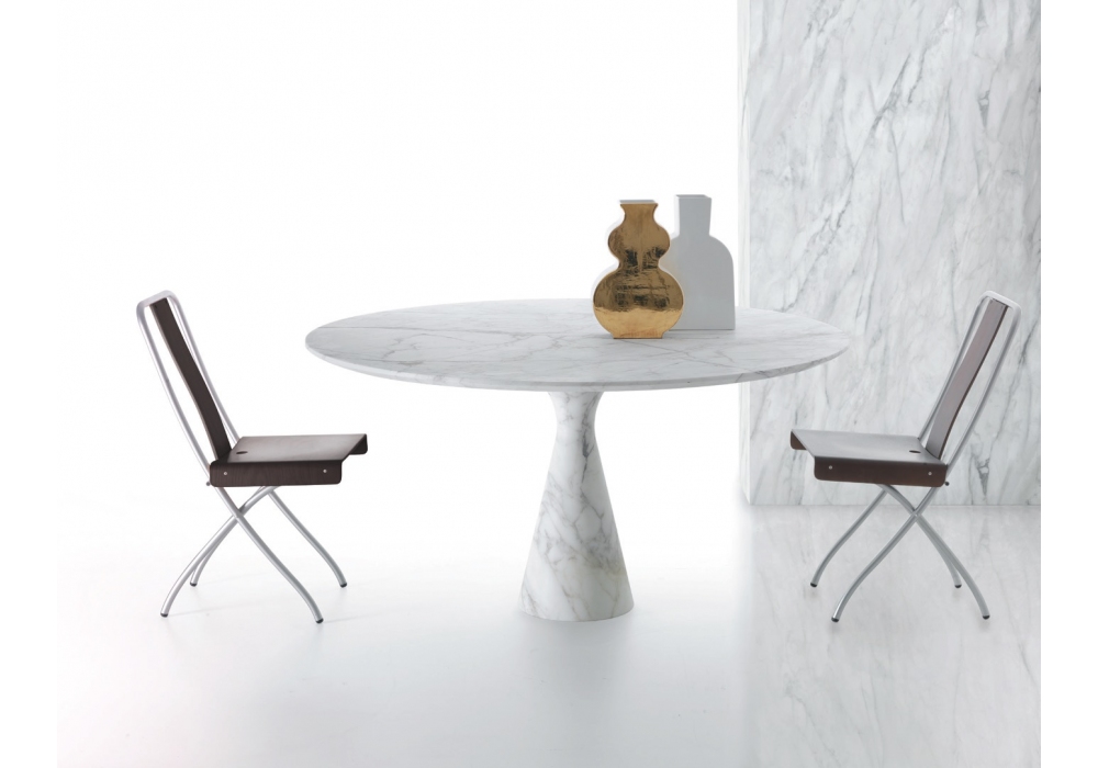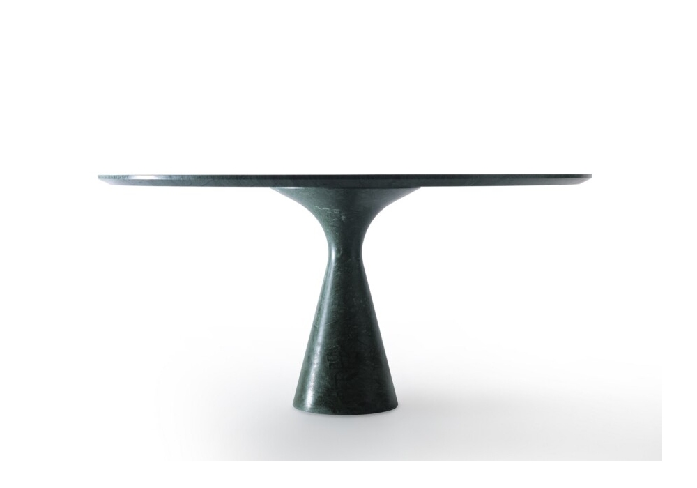 Torre Maxi diseñada por Enzo Berti para Kreoo es una mesa redonda realizada con una tapa circular marcada por un borde delgado, luego inclinada y trabajada a 45°. Disponible en diferentes acabados.