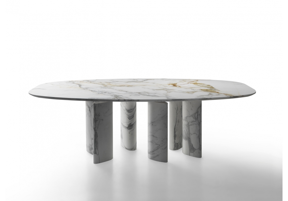 Ellenico diseñada por Enzo Berti para Kreoo es una mesa realizada completamente en mármol. Caracterizado por seis bases elipsoidales alargadas con diferentes orientaciones y una parte superior ovalada que descansa sobre una estructura delgada y se distancia de las patas, pareciendo casi suspendida. Disponible en diferentes acabados.