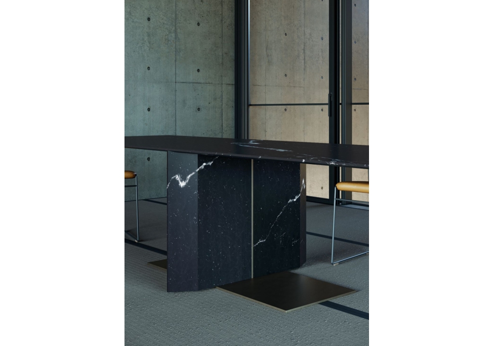 Kalende diseñada por Enzo Berti para Kreoo es una mesa con base en metal y estructura en mármol. Un elemento de mármol que soporta la parte superior descansa perpendicularmente sobre la base.