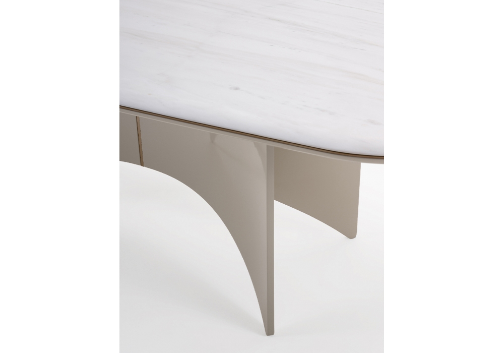 Blues diseñada por Giuseppe Viganò para Turri es una mesa con estructura en tablero de partículas curvado chapado en nogal o MDF acabado lacado poliéster brillante monocolor. Tapa enchapada en nogal o mármol.