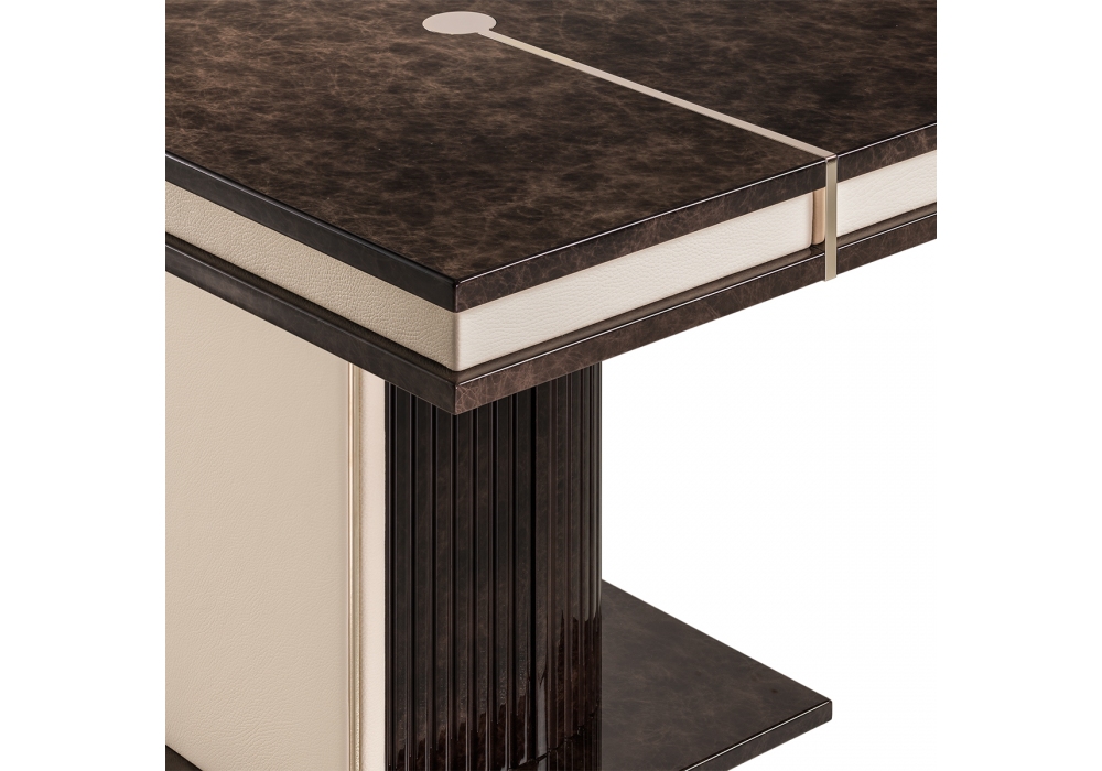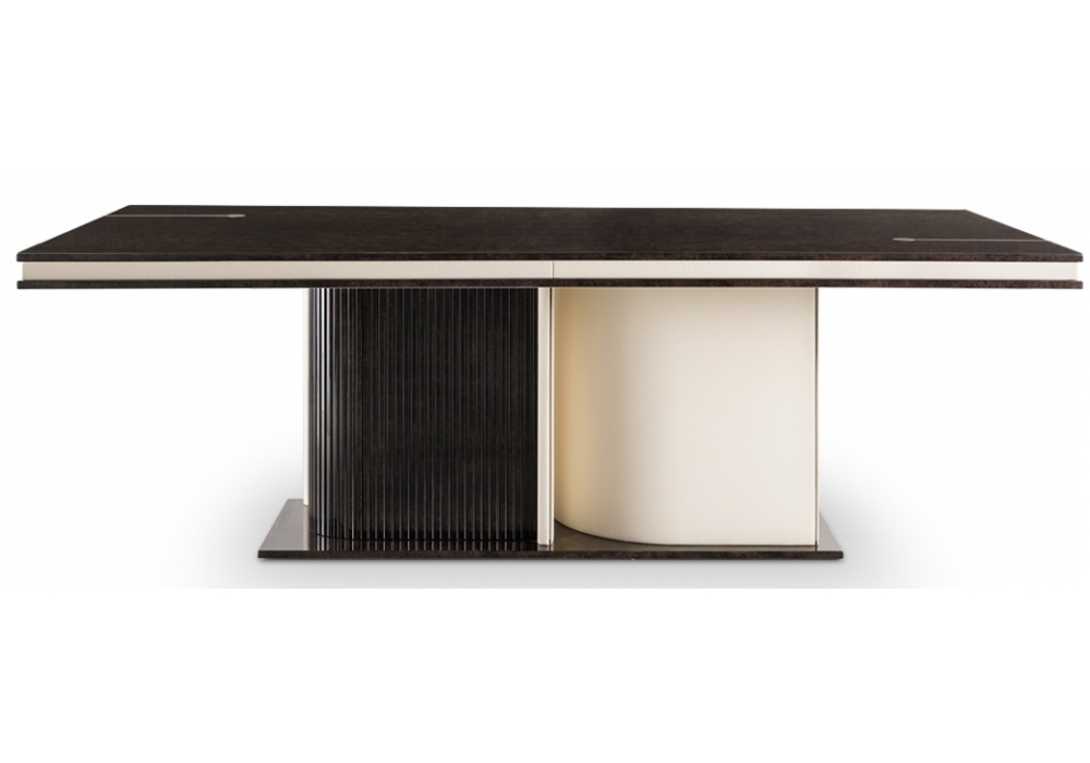 Eclipse diseñada por Andrea Bonini para Turri es una mesa con estructura en MDF y paneles de aglomerado con acabado poliéster brillante decorado a mano y tapizado en piel. Tapa con acabado pulido. Disponible en diferentes dimensiones.