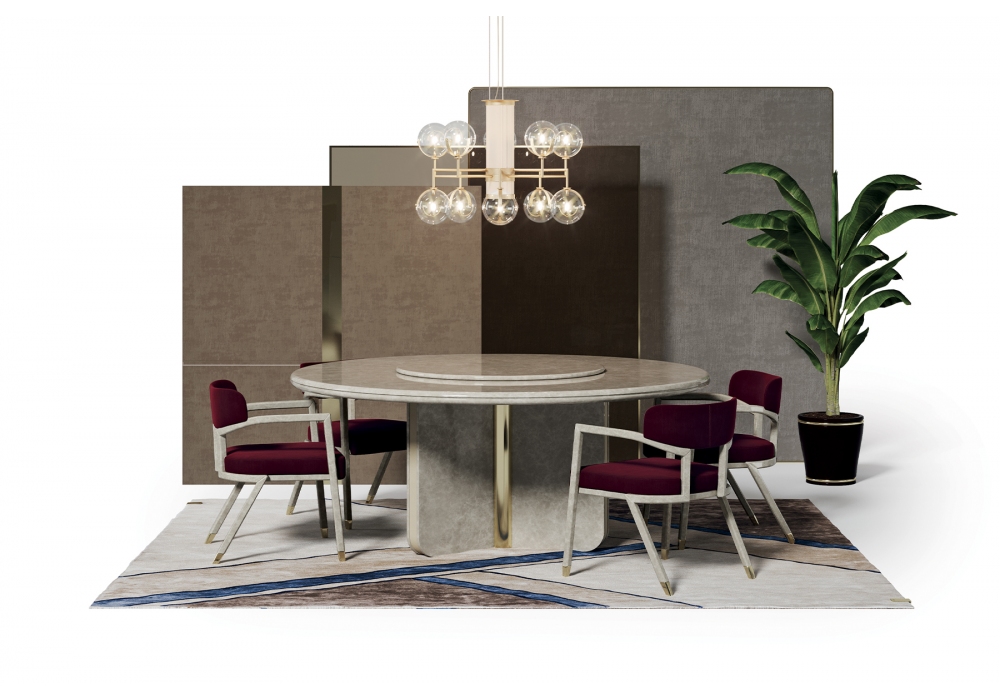 Madison diseñada por Andrea Bonini para Turri es una mesa redonda con estructura en MDF y madera contrachapada con acabado poliéster brillante decorado a mano. La base de tres velas está adornada con inserciones de cuero y un detalle central de metal dorado. Disponible en diferentes dimensiones.