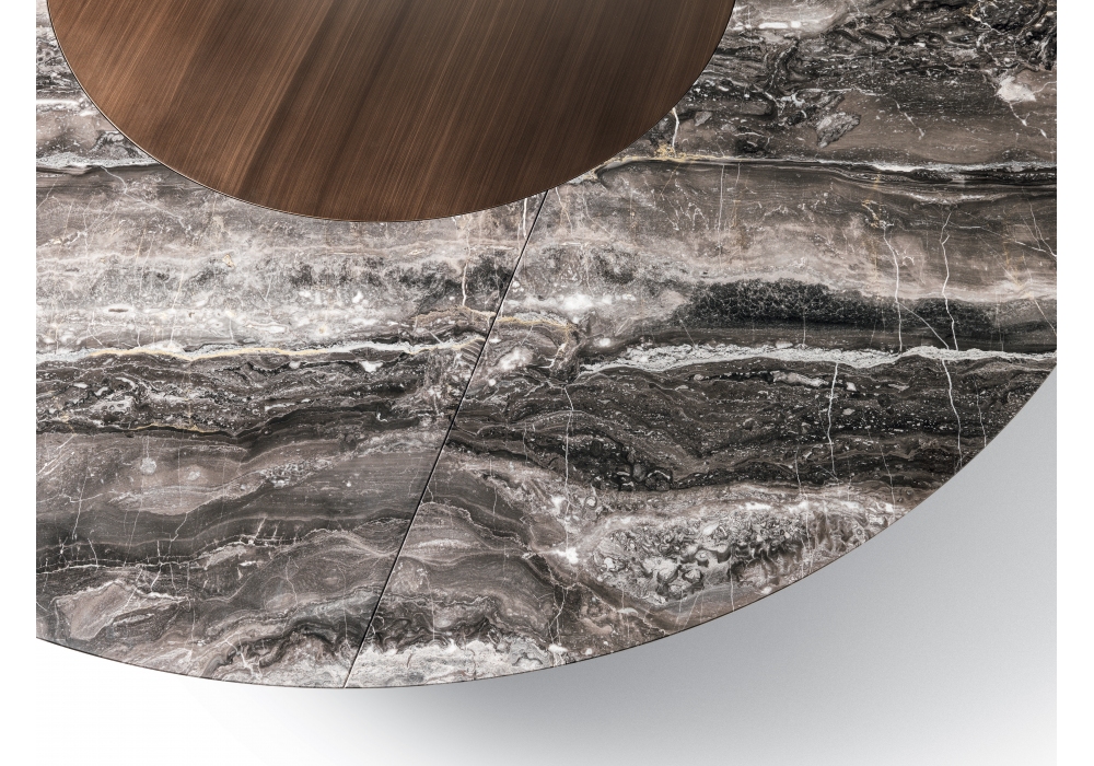 Ala Round diseñada por Ferruccio Laviani para MisuraEmme es una serie de mesas con base de madera en esencia, laca mate o laca mate envejecida. Encimera redonda de mármol con encimera lacada. Para la tapa redonda de 155 cm y 165 cm de diámetro, existe la opción de una tapa de mármol con forma giratoria (Lazy Susan) apoyada sobre la tapa central; para las demás dimensiones el tablero giratorio de empotrar, siempre obligatorio, es de mármol, lacado mate o lacado mate envejecido.