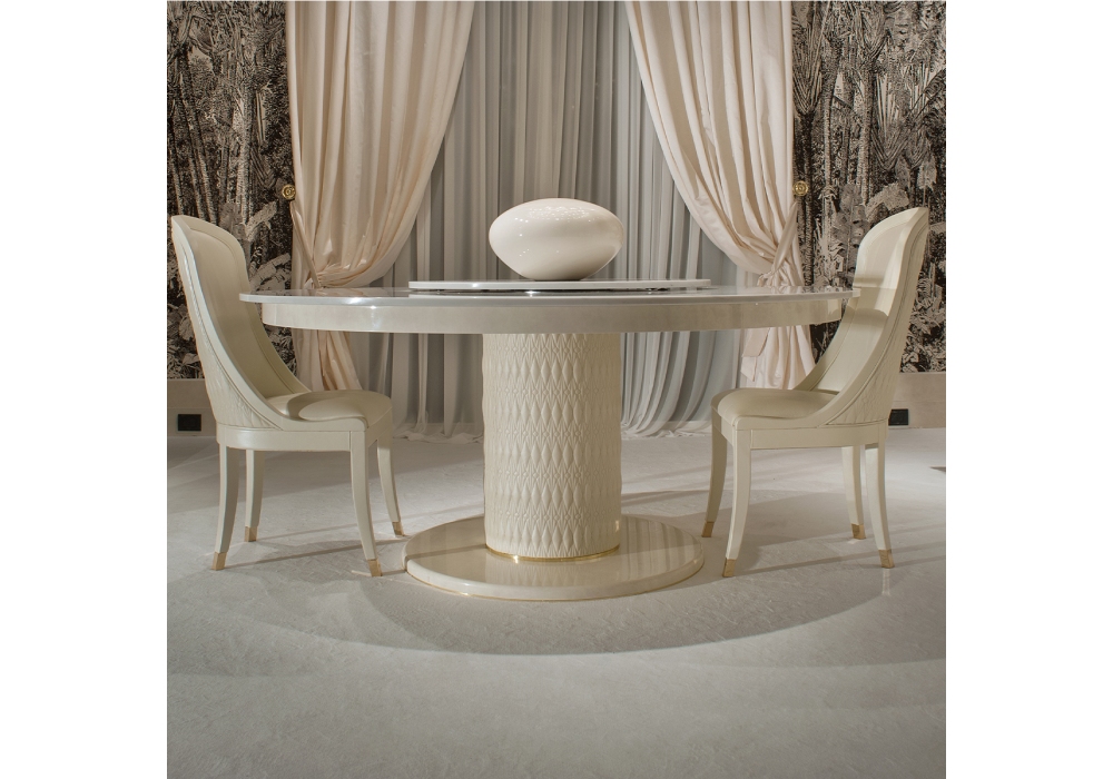 Numero Tre diseñada por Roberto Serio para Turri es una mesa redonda con base y tablero en MDF y paneles de aglomerado con acabado brillante. La columna está tapizada en diferentes pieles con bordados. Detalles de metal dorado. Disponible en diferentes dimensiones y en la versión con o sin tapa giratoria Lazy Susan.
