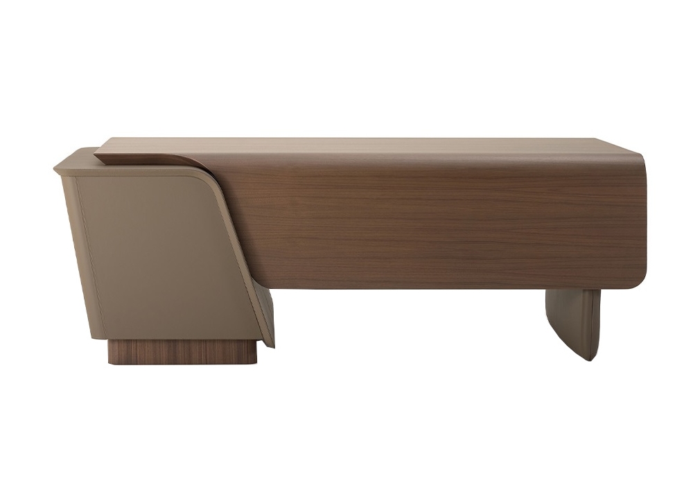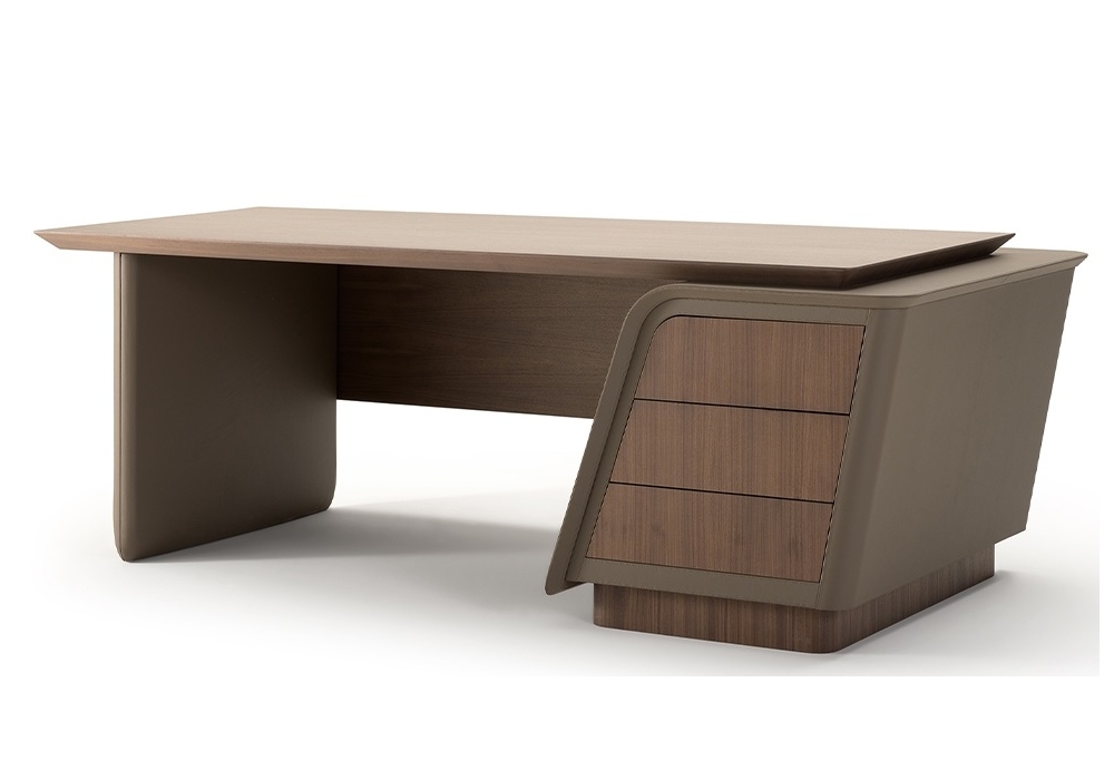 Blues diseñado por Giuseppe Viganò para Turri es un escritorio con estructura realizada con paneles de tableros de partículas enchapados en nogal y madera contrachapada con revestimiento en piel. Disponible en la versión con cajonera en madera de nogal o revestida en piel.