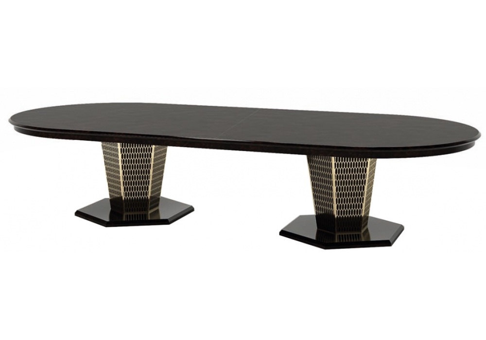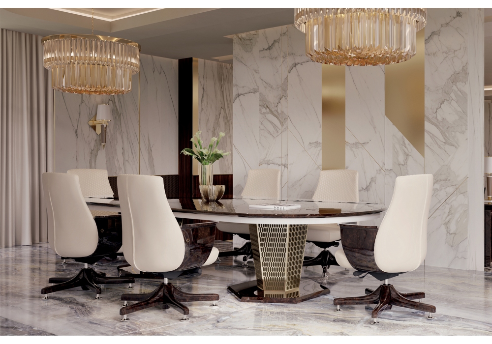Vogue diseñada por Andrea Bonini para Turri es una mesa de conferencias con estructura y tapa en MDF lacado brillante y patas revestidas en cuero con aplicación de malla metálica con diseño de rombos.