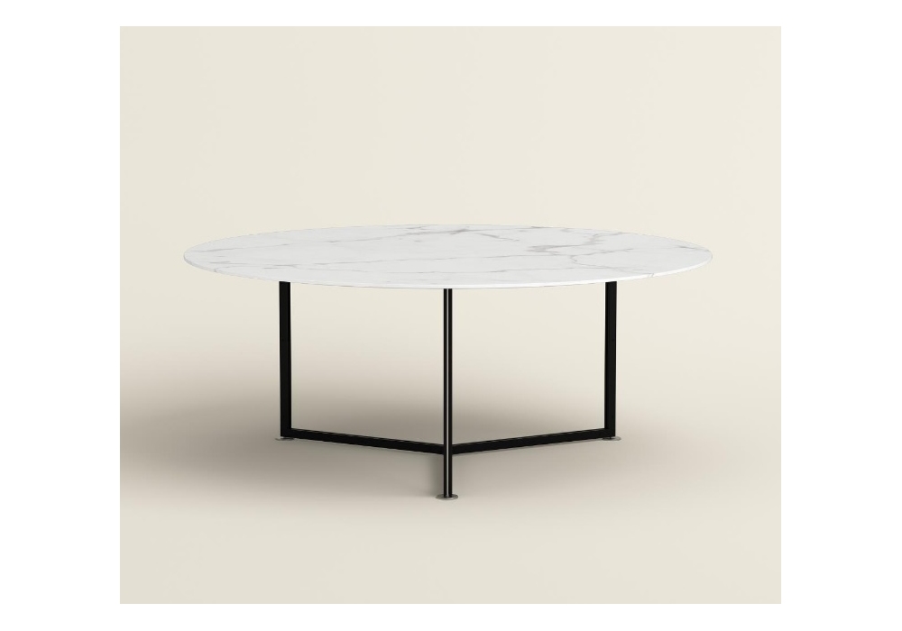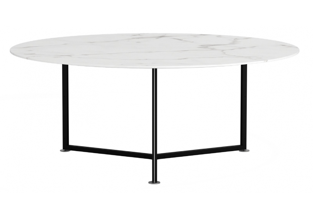The Hess diseñada por Mikal Harrsen para Karakter es una mesa realizada con estructura de acero pintado en polvo, detalles en acero inoxidable y tapa de mármol de Ibiza.