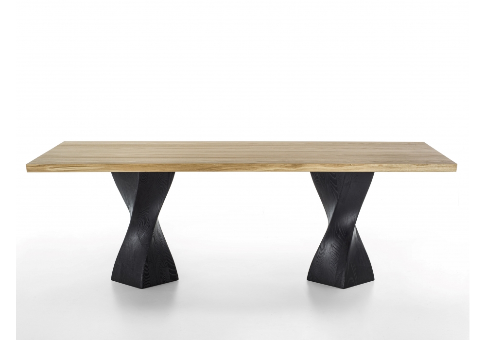Simple Twist diseñada por Studio Excalibur para Riva 1920 es una mesa con tablero de blockboard enchapado en madera maciza y cantos redondeados. Presenta dos patas de madera maciza con un acabado pigmentado. La mano de obra le da movimiento y dinamismo.