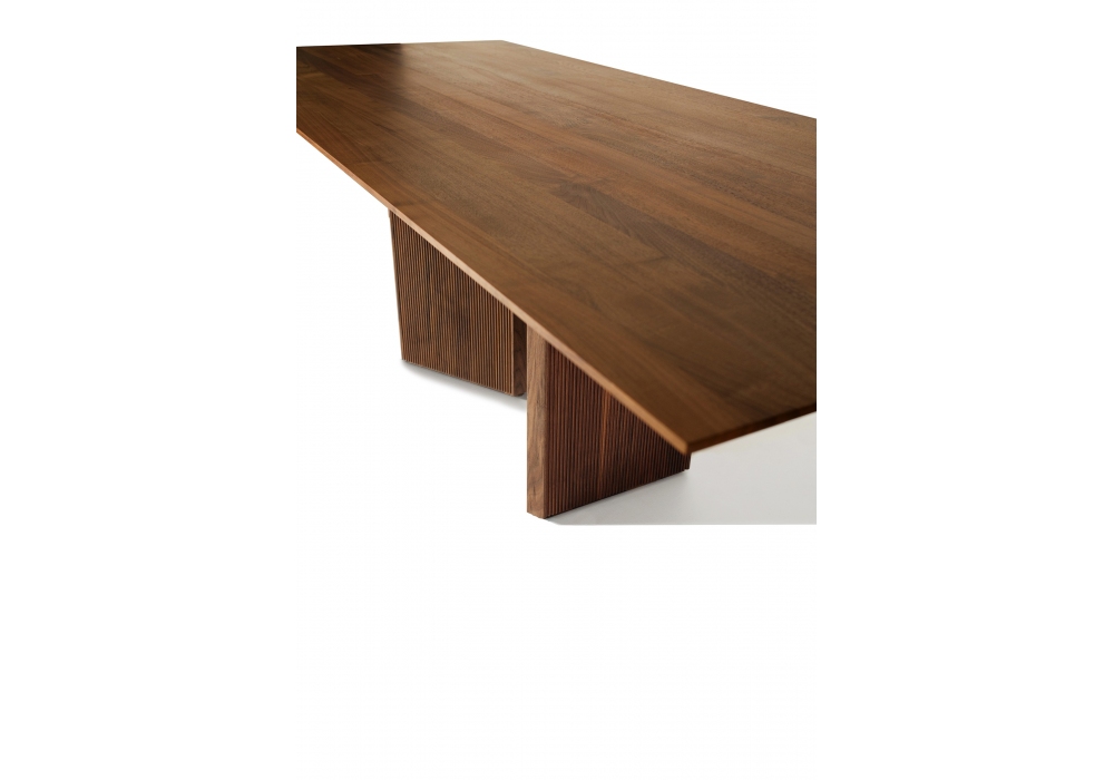 Revo diseñada por Giuliano & Gabriele Cappelletti para Riva 1920 es una mesa con tablero realizado completamente en madera maciza con listones encolados de espesor reducido. La base está formada por patas en forma de prisma, cada una caracterizada por tres vértices de madera maciza, y por superficies lisas o con acabado Fresart, lo que crea un efecto geométrico moderno y dinámico.