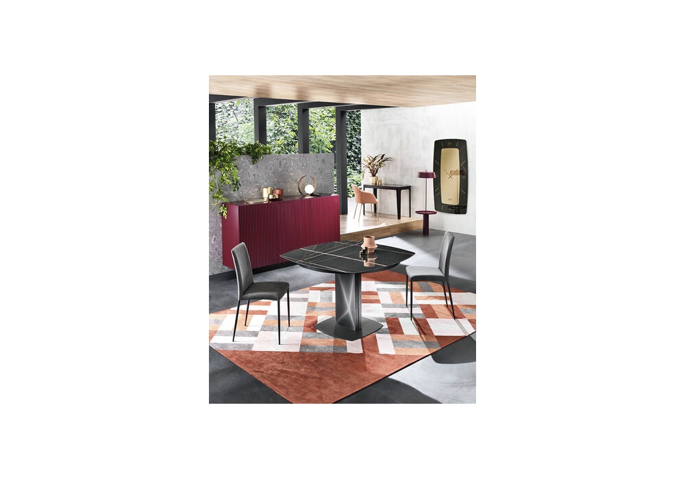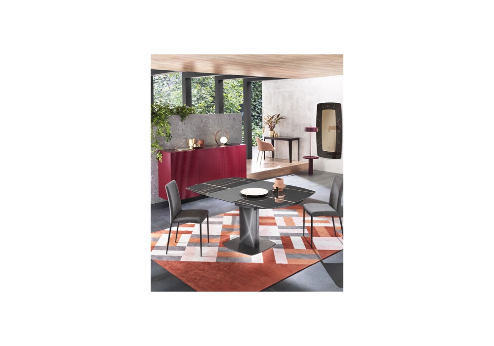 Sabino diseñada por Riflessi es una mesa con base en metal pintado o revestido en acero espejado y tapa en cerámica. Disponible en diferentes dimensiones.