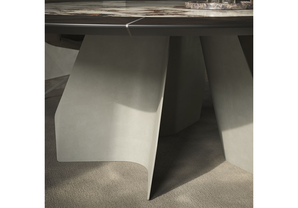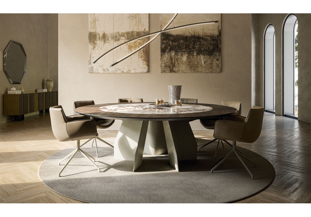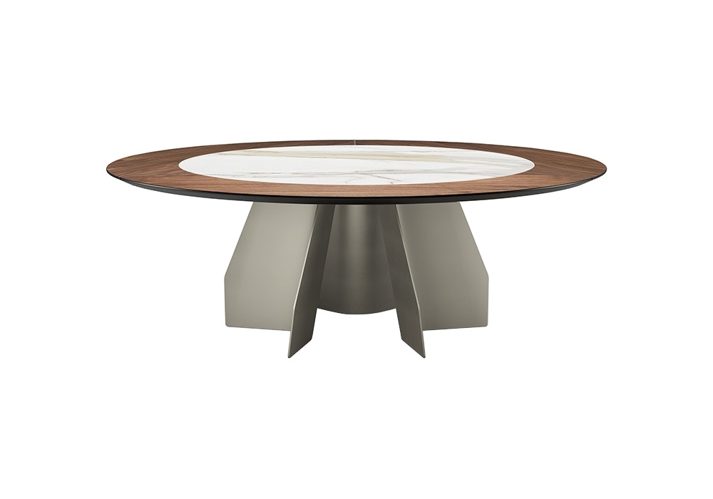 Senator Ker-Wood Round diseñada por Paolo Cattelan para Cattelan Italia es una mesa con base en acero gofrado titanio o bronce, tablero en nogal Canaletto o roble ahumado e inserto en cerámica Marmi en diferentes acabados. Detalles en cromo negro. Disponible en diferentes tamaños y en la versión "T" con inserto giratorio de cerámica.